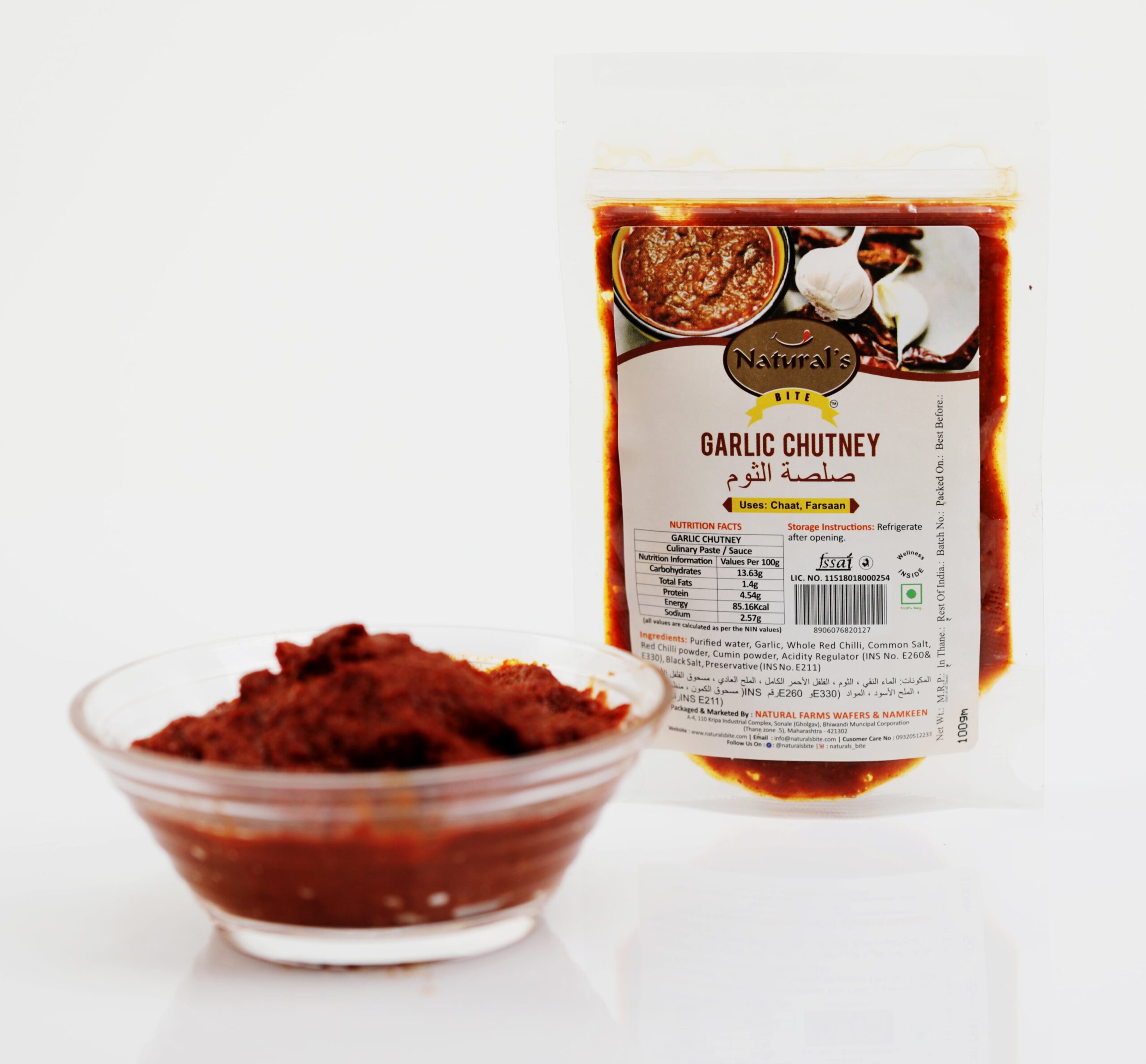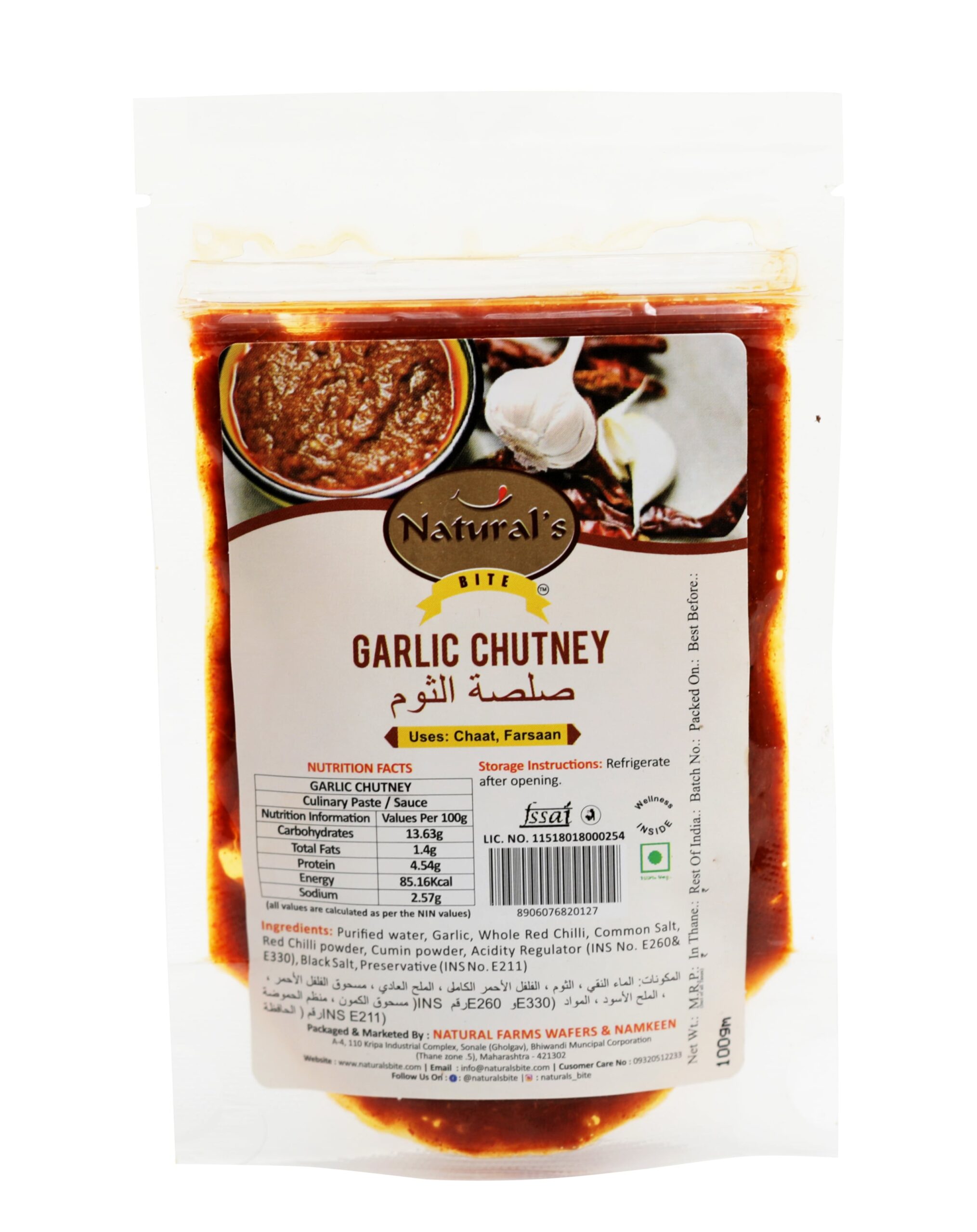 Purified water, garlic, whole red chilli, common salt, red chilli powder, cumin powder, acidity regulator (Ins no. E260 & E330 black salt, preservative (Ins no. E211).